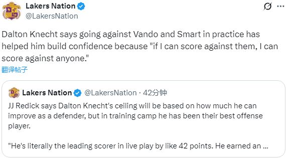 赛后雷迪克证实此事,他表示,训练营期间,克内克特打出了湖人所有球员中的最佳进攻表现。球队有数据追踪,在实战对抗中,他的得分比任何其他队友都高出42分,且投篮命中率在60%左右。但雷迪克也表示,克内克特的上限将取决于他的防守。